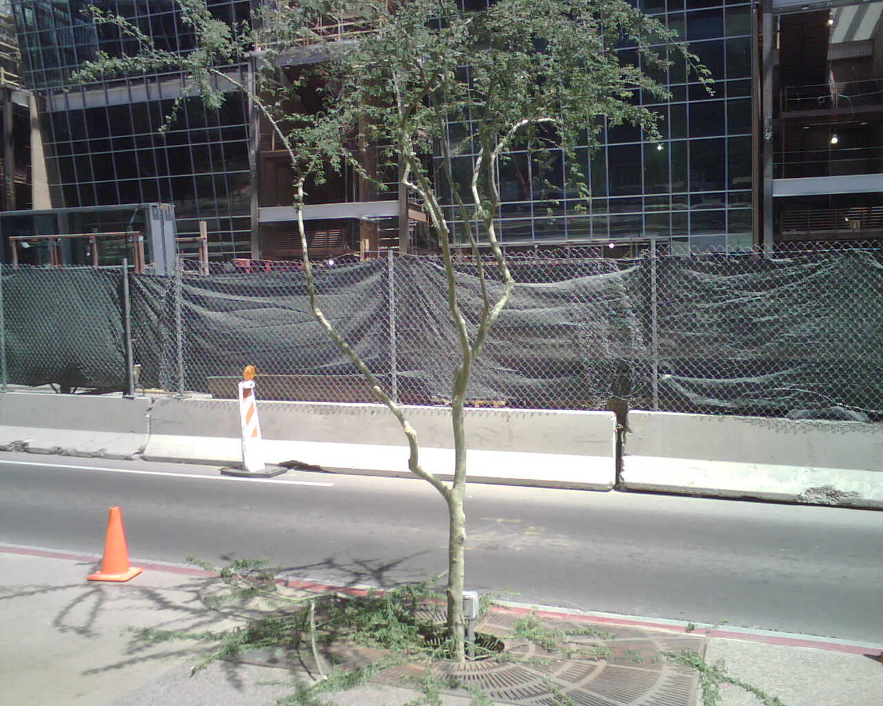 While walking to the Mayor’s State of the City address a week ago, we came across this just-trimmed — okay, “hacked” — tree, along with many other similarly-trimmed trees up and down the street. Hmmm… if shade, sustainability, and going “green” is a priority for our fair city, shouldn’t trees be given the chance to, well, grow?