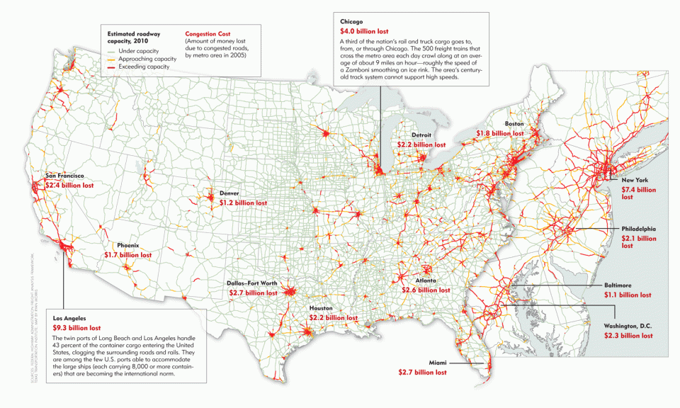 In the March 2008 issue of The Atlantic Monthly an opinion piece by Bruce Katz and Robert Puentes analyzes America’s crumbling infrastructure and assesses the money lost due to congestion around major metropolitan areas. Katz and Puentes point to why infrastructure is such a valuable commodity in a global economy:
