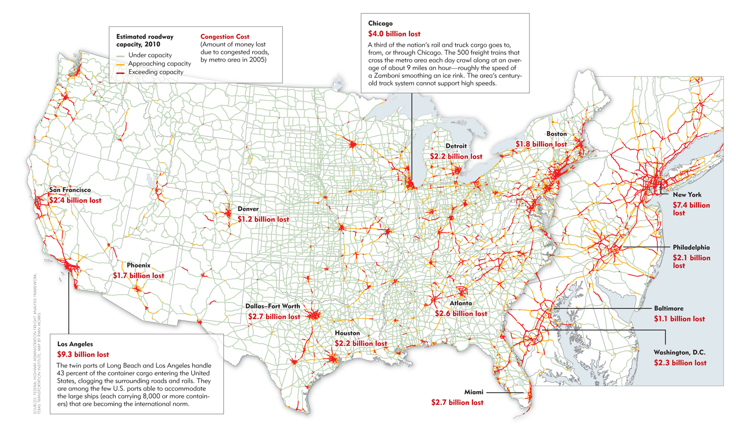 In the March 2008 issue of The Atlantic Monthly an opinion piece by Bruce Katz and Robert Puentes analyzes America’s crumbling infrastructure and assesses the money lost due to congestion around major metropolitan areas. Katz and Puentes point to why infrastructure is such a valuable commodity in a global economy: