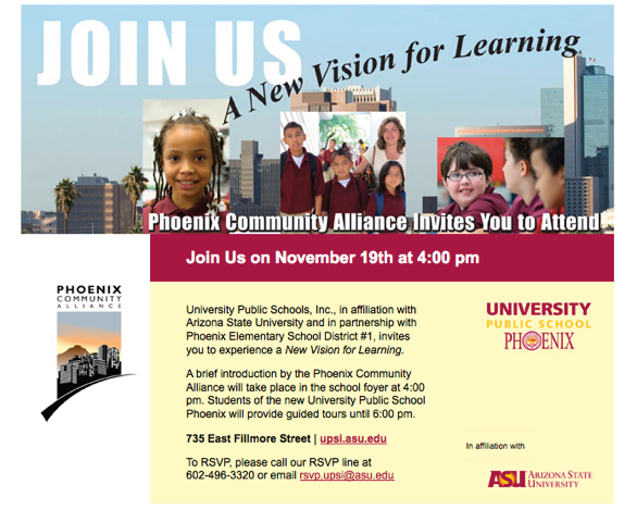 Posted on November 18, 2009 Tour downtown Phoenix’s newest school, Nov. 19 Share this: Click to share on Facebook (Opens in new window) Facebook Click to share on X (Opens in new window) X Like Loading... Related