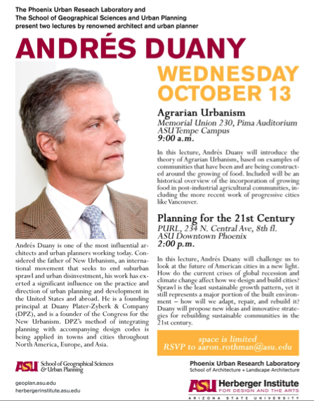 The Phoenix Urban Research Laboratory (PURL) and the School of Geographical Sciences and Urban Planning at Arizona State University (ASU) are hosting a lectures in downtown Phoenix by new urbanist luminary Andrés Duany on Wednesday, October 13.