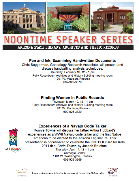 Begin 2011 with a new noontime discussion series sponsored by the Arizona State Library, Archives and Public Records! These monthly presentations on a variety of historical, literary and research topics will take place at the Capitol, Polly Archives Building or Carnegie Center on the second Thursday of every month! All presentations are from 12 to 1 PM and are free and open to the public.