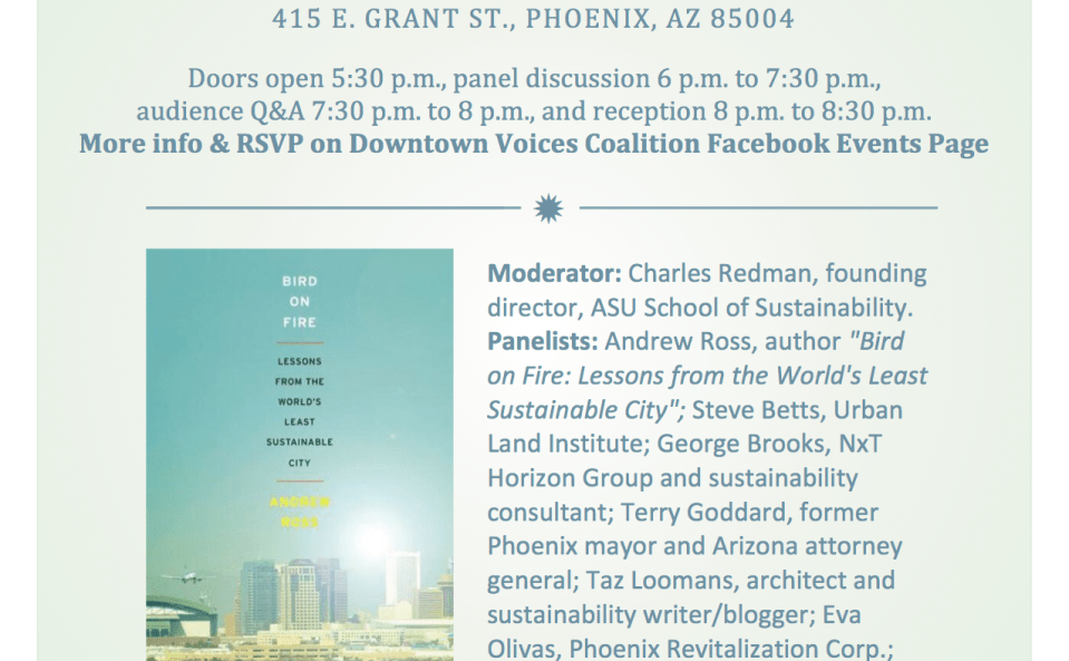 According to Susan Copeland, steering committee chair of Downtown Voices Coalition, “Issues of sustainability are paramount to the future of Phoenix. Ross’ book is a great springboard from which to begin, or continue, discussion.”