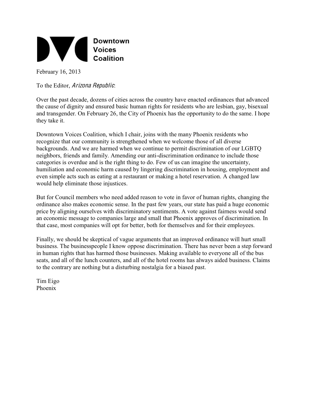 Pictured here is Downtown Voices Coalition’s statement on the proposed amendment to the City of Phoenix’s anti-discrimination policy. The organization’s position on this matter is in keeping with one of its nine guiding principles – diversity – outlined here: