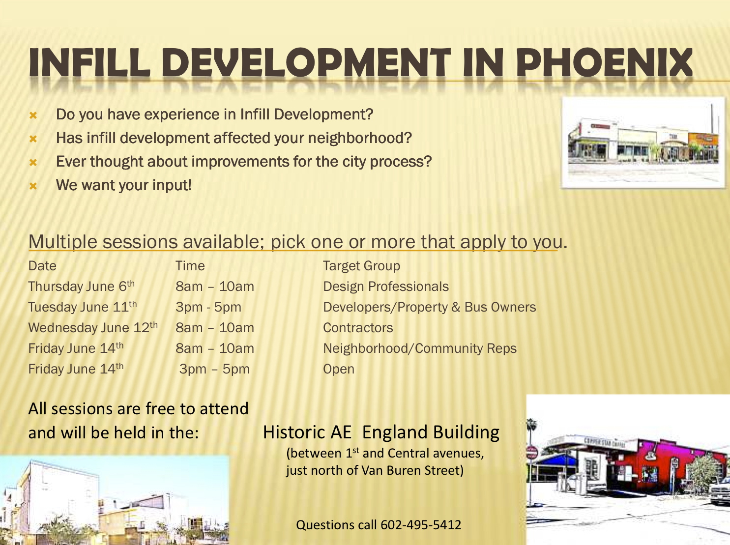 Posted on June 2, 2013June 2, 2013 City of Phoenix to host community meetings on infill development Share this: Click to share on Facebook (Opens in new window) Facebook Click to share on X (Opens in new window) X Like Loading... Related