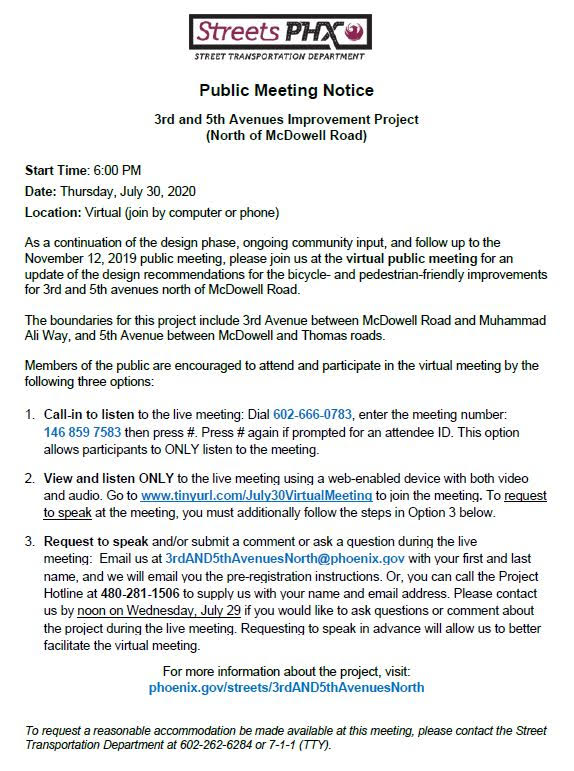 Posted on July 18, 2020July 18, 2020 Public meeting for 3rd & 5th Avenues Improvement Project (north of McDowell) Share this: Click to share on Facebook (Opens in new window) Facebook Click to share on X (Opens in new window) X Like Loading... Related