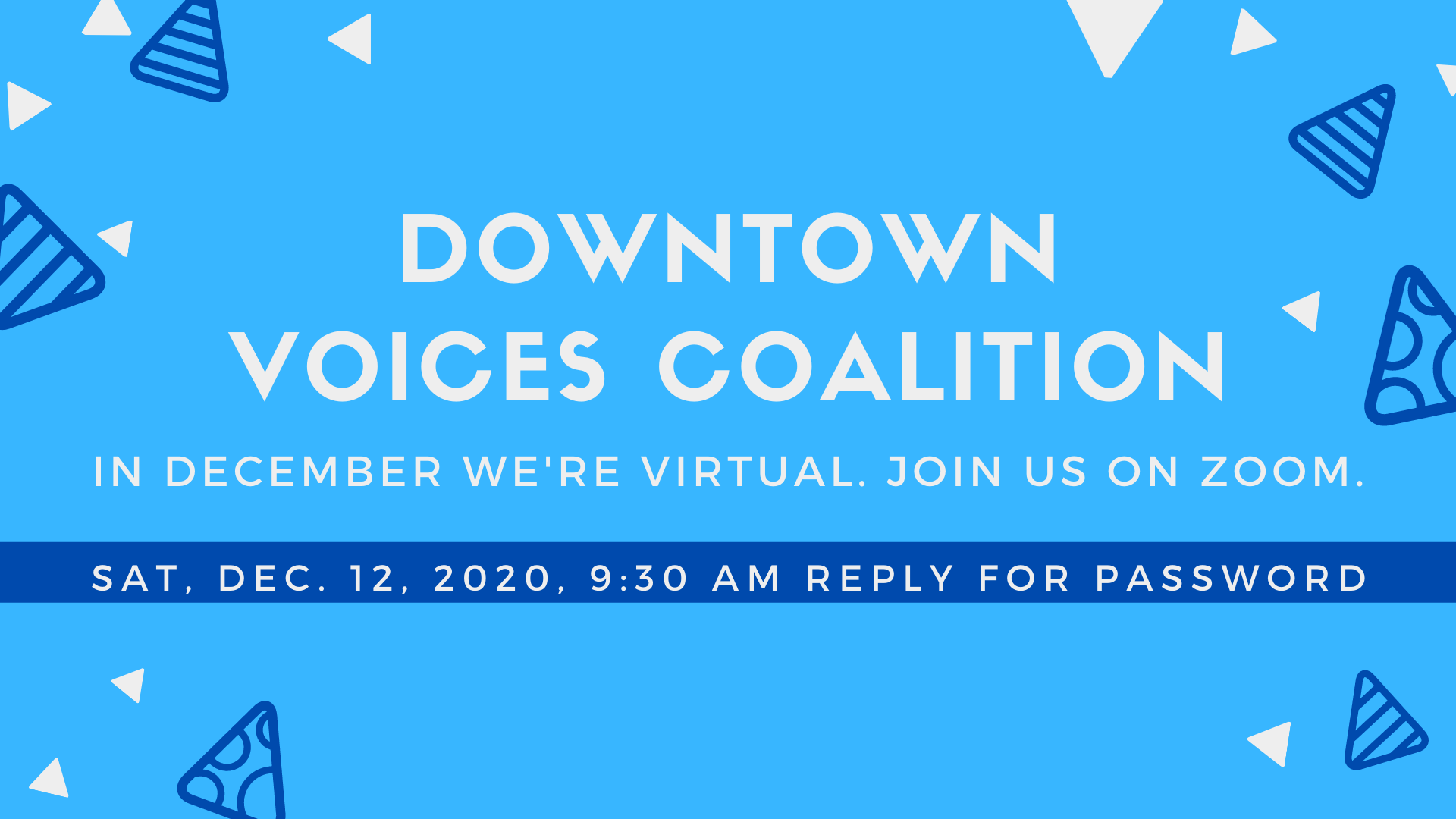 The Downtown Voices Coalition Steering Committee will hold its usual 2nd Saturday of the month community meeting on December 12, 2020 at its usual start time of 9:30 a.m. via Zoom. Here’s the agenda: