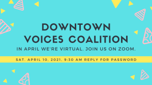 The Downtown Voices Coalition Steering Committee will hold its usual 2nd Saturday of the month community meeting on April 10, 2021 at its usual start time of 9:30 a.m. via Zoom. The agenda is now being finalized.