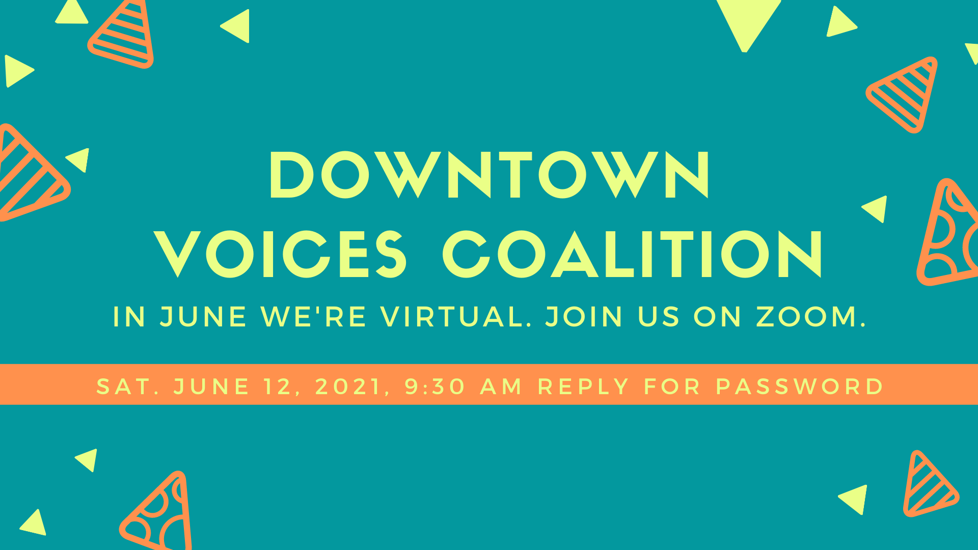 The Downtown Voices Coalition Steering Committee will hold its usual 2nd Saturday of the month community meeting on June 12, 2021 at its usual start time of 9:30 a.m. via Zoom. Here’s the agenda: